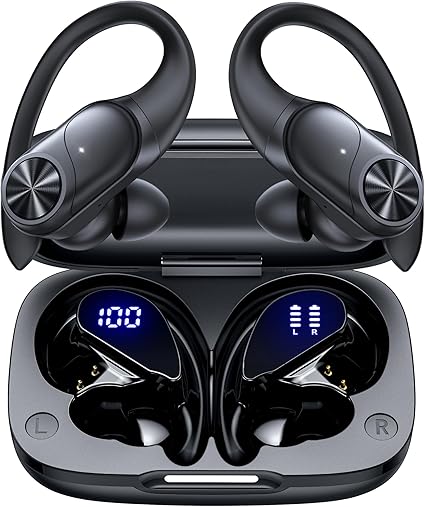 PocBuds Bluetooth Headphones Wireless Earbuds 80hrs Playtime Wireless Charging Case Digital Display Sports Ear Buds with Earhook Deep Bass IPX7 Waterproof Over-Ear Earphones for TV Phone Laptop Black
