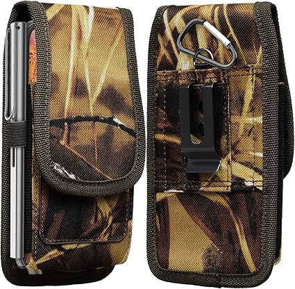 Heavy-duty nylon phone holster compatible with large smartphones, featuring 4-way wear options, RFID card slot, pen holder, and secure Velcro closure — ideal for outdoor or work use.